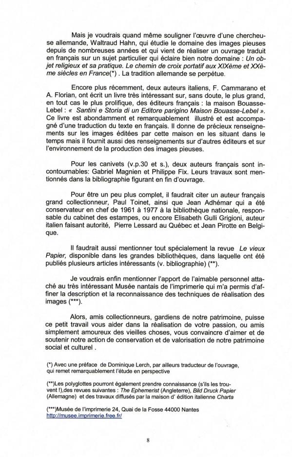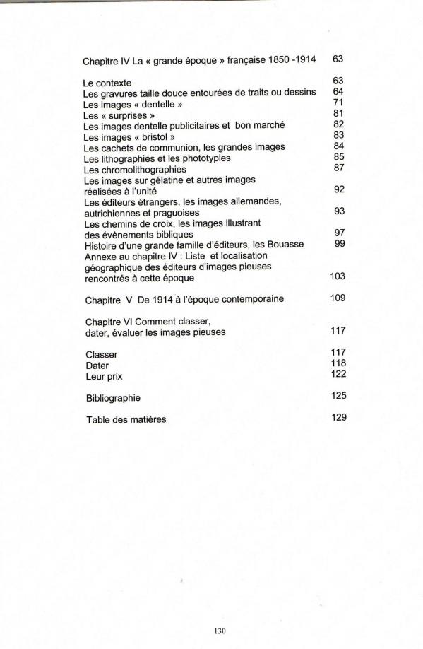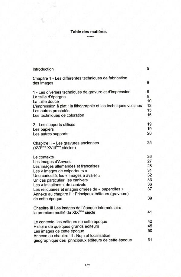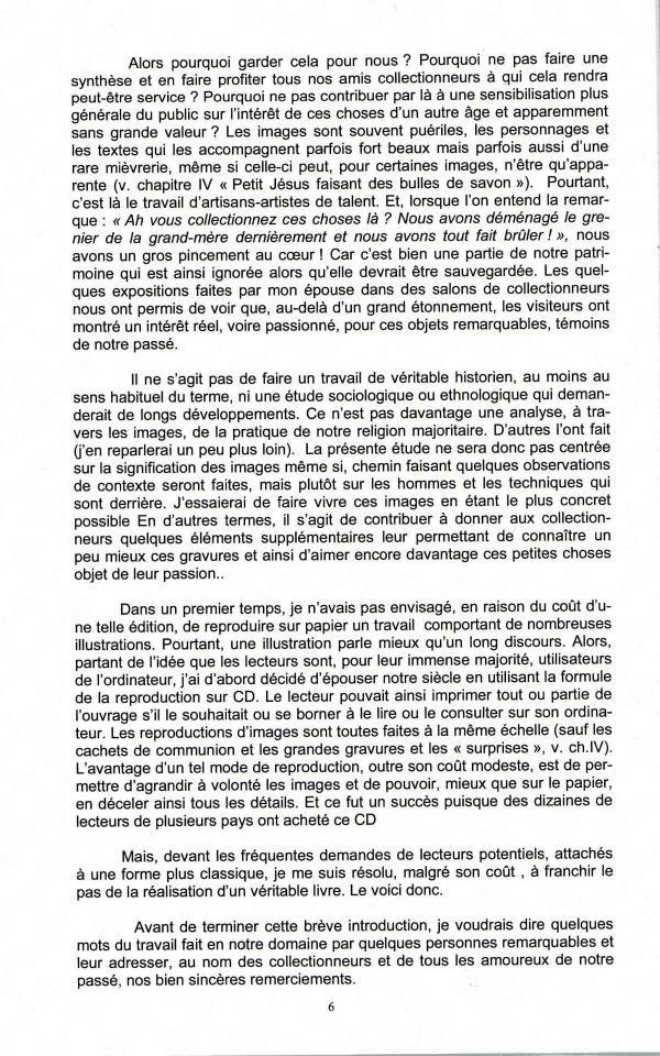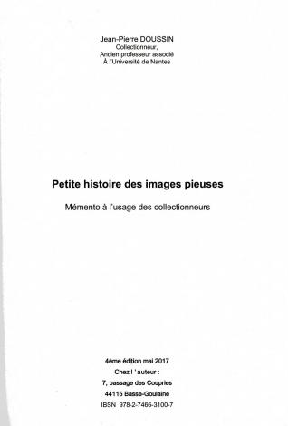 Cet ouvrage de 130 pages, de format 21 x 29,4, contenant quelques 350 illustrations a été construit en suivant un plan voisin de celui de ce site et poursuit le même objectif, rendre service aux collectionneurs et contribuer à l'enrichissement des connaissances de tous ceux qui s'intéressent à la protection de notre patrimoine historique et artistique. On peut y trouver bien sûr beaucoup plus de renseignements que ceux, forcément sommaires, fournis sur ce site, renseignements très variés et très détaillés comprenant les aspects techniques de la production des images, le contexte historique, social et religieux de chacune des grands époques, la description des caractéristiques de toutes les catégories d'images, les éléments permettant de les situer dans le temps, parfois de manière très précise, la liste des éditeurs et leur situation géographique, l'histoire de ceux qui ont marqué leur temps... Il s'agit d'une synthèse que l'on ne trouve nulle part ailleurs, mais, grâce à la bibliographie signalée, le lecteur a encore la possibilité d'approfondir certains points lorsque cela lui semble utile. Compte tenu de la somme d'illustrations à reproduire, son édition sur papier était évidemment très onéreuse. Il a donc d'abord été édité par l'auteur sur CDRom, ce qui est loin d'être un inconvénient, ce support, inhabituel pour les chercheurs de "vieux papiers", présente au contraire, par les possibilités d'agrandissement qu'il procure, l'avantage de permettre un examen beaucoup plus approfondi des détails de chacune des images illustrant l'ouvrage.